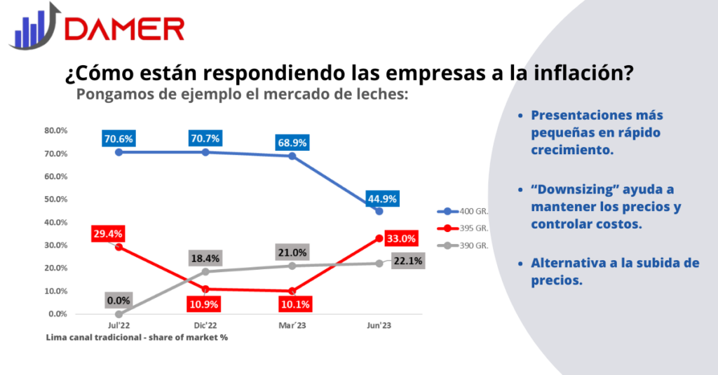 En el análisis de la evolución del mercado de productos de consumo masivo en el canal tradicional, se ha detectado que varios fabricantes se han volcado hacia la estrategia de “Downsizing”, reduciendo el contenido de sus presentaciones en respuesta a la inflación que somete al país; de esta manera no afectar los precios al consumidor final. Tomaremos como ejemplo el mercado de leches, en el cual se observa que las presentaciones de 400 gramos están siendo reemplazadas por nuevas versiones de 395 gramos y 390 gramos, las cuales están ganando una participación significativa en el mercado.